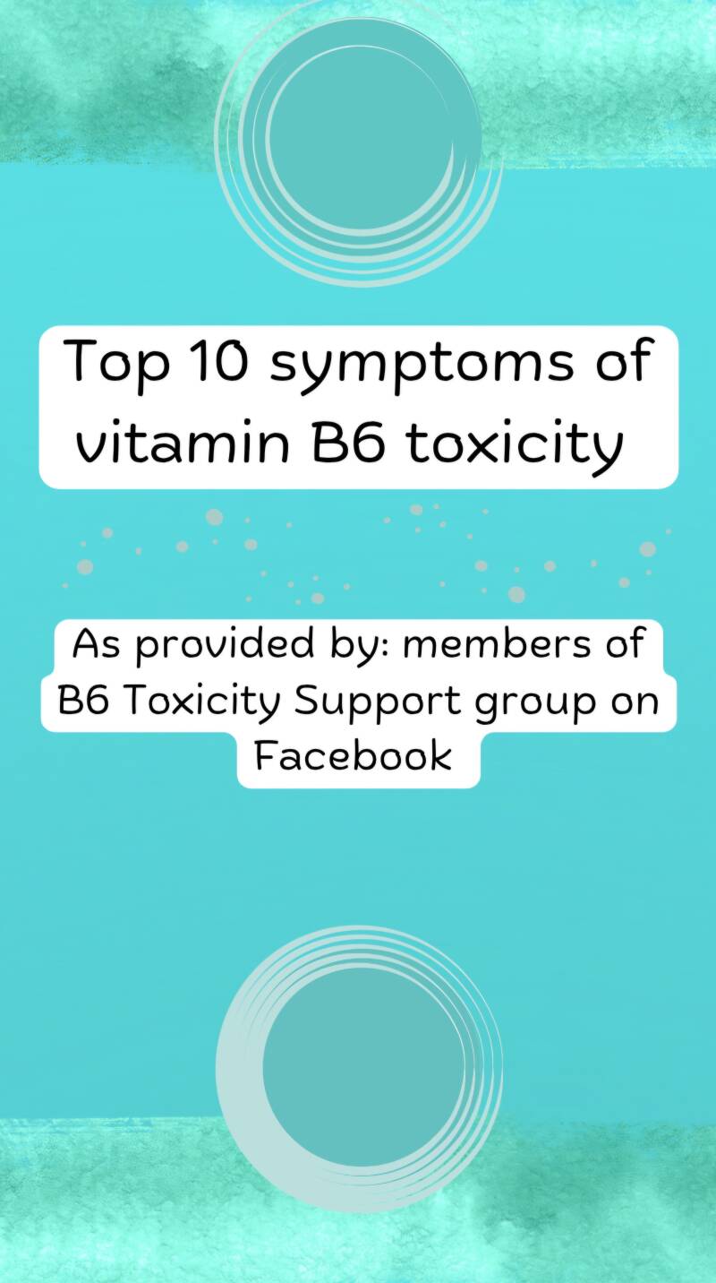 We asked in the B6 Toxicity Support Group what the most common symptoms were. Here are the results of the top 10 symptoms. There are many other symptoms not listed. But here's a starting place.